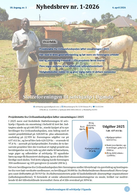 Om årsstatus for 2025, forestående generalforsamling med ugandisk besøg, fremskridt på kvægfarm, videreførelse af udbredelsesinitiativ i nabokommune, ny bevilling fra Civilsamfundspuljen samt anvendelse af rådighedsbeløb.